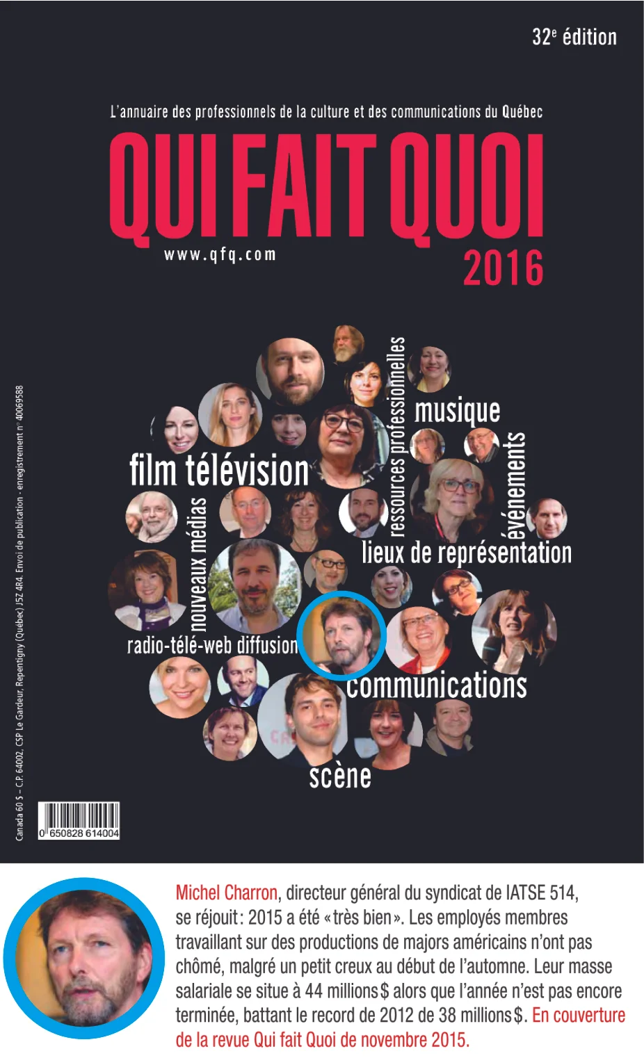 Le syndicat montréalais est le seul de toute la famille IATSE qui a eu le droit de choisir son numéro, ce dont Michel Charron se montre très fier, car ce numéro demeure très symbolique. Lorsque les équipes américaines téléphonent, ils reconnaissent tout de suite le 514 et l’identifie à la métropole québécoise. Preneur de son de métier, partenaire du Studio Modulations, il accepte de prendre le poste de directeur général en juillet 2006, alors que IATSE 514 se cherchait ce que les Américains appellent un « businessagent », lapersonneresponsabledefairele suivi. Ces postes de« business agent » s’avèrent hyper stratégiques et 90% d’entre eux viennent directement du terrain, car ils connaissent les mécaniques du milieu. Grâce à son expérience chez Modulations, la gestion de personnel ne lui faisait pas peur. En 2013, il reçoit le Prix du Président international d’IATSE lors du dernier Congrès quadriennal, en reconnaissance « du dévouement exceptionnel dont il fait preuve à l’égard de son travail, de son syndicat et de ses confrères et consoeurs ». Modeste, il affirme qu’il doit ce prix à toute son équipe. « Il n’y en a pas eu de facile pour le 514, encore aujourd’hui, des gens me considèrent comme un traître à la nation, dit-il. Mais, nous avons un conseil de direction formidable et nous avons le soutien du conseil et de tous les membres. »